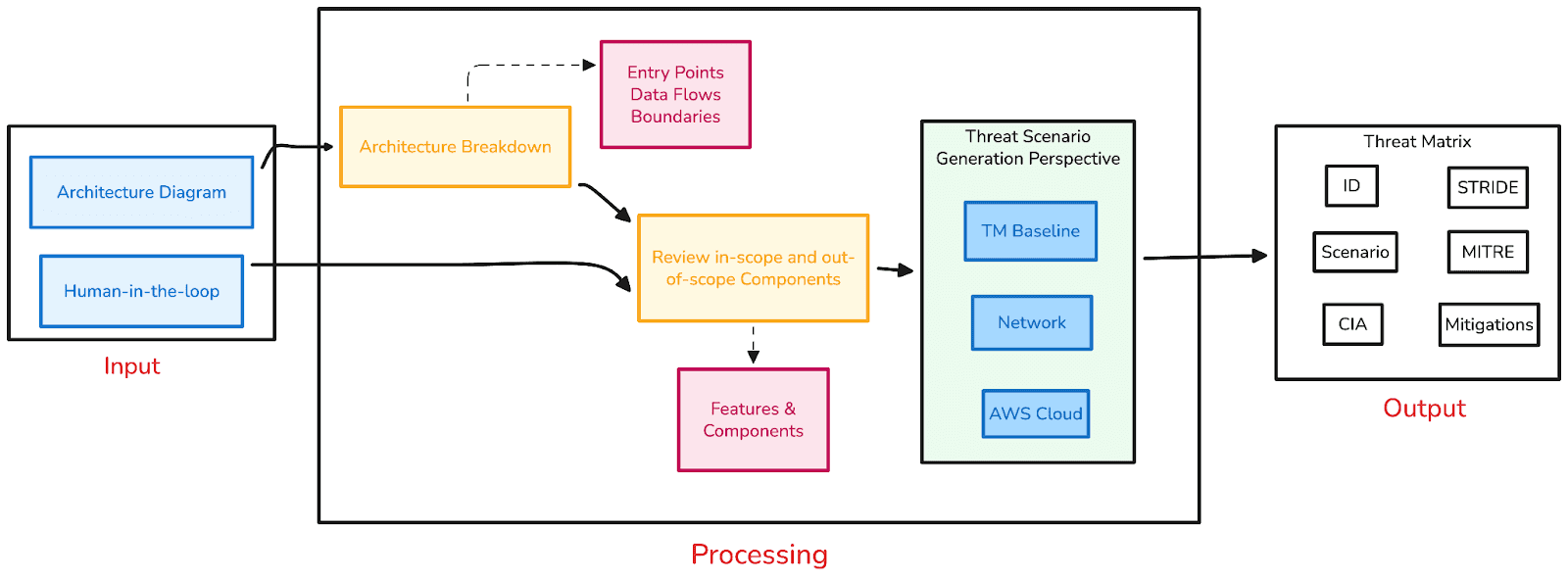With a prompt chaining technique, it mimics the thought process of security engineers, threat modeling is structured as a two-stage pipeline.