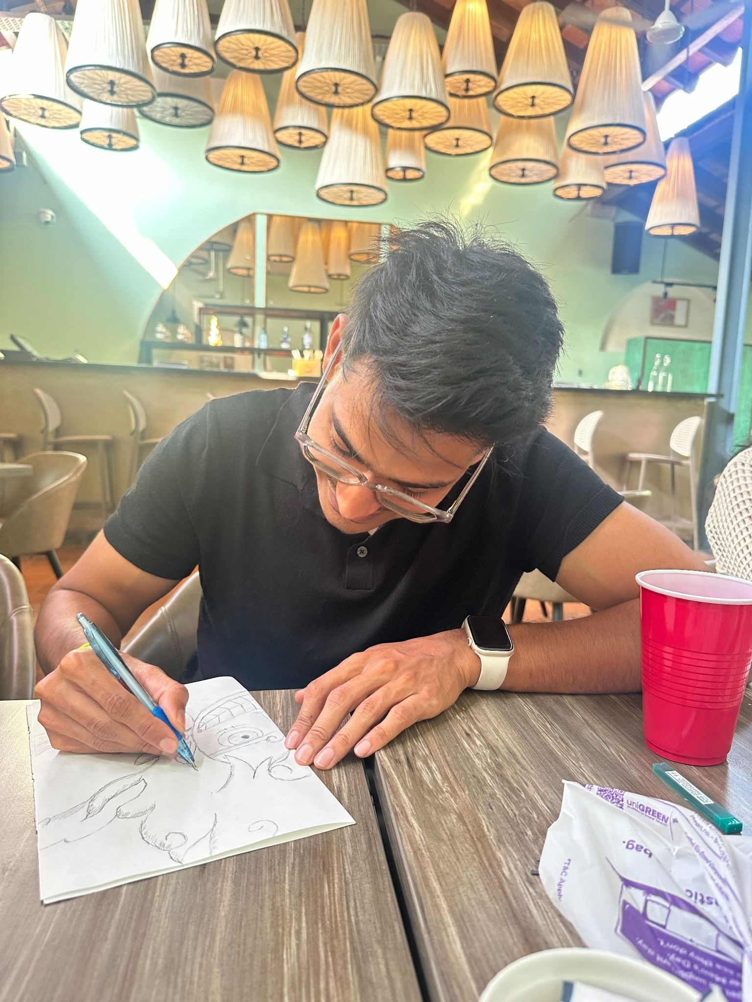 “We were in Pondicherry. We thought we should go to the beach and all. But then we ordered pencils and sheets, went to a cafe, started sketching, and I was completely locked in. I spent like one hour sketching. I didn't even know it's been one hour, but it was so satisfactory."
