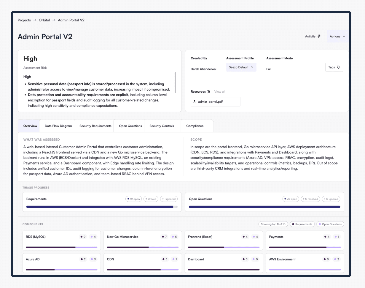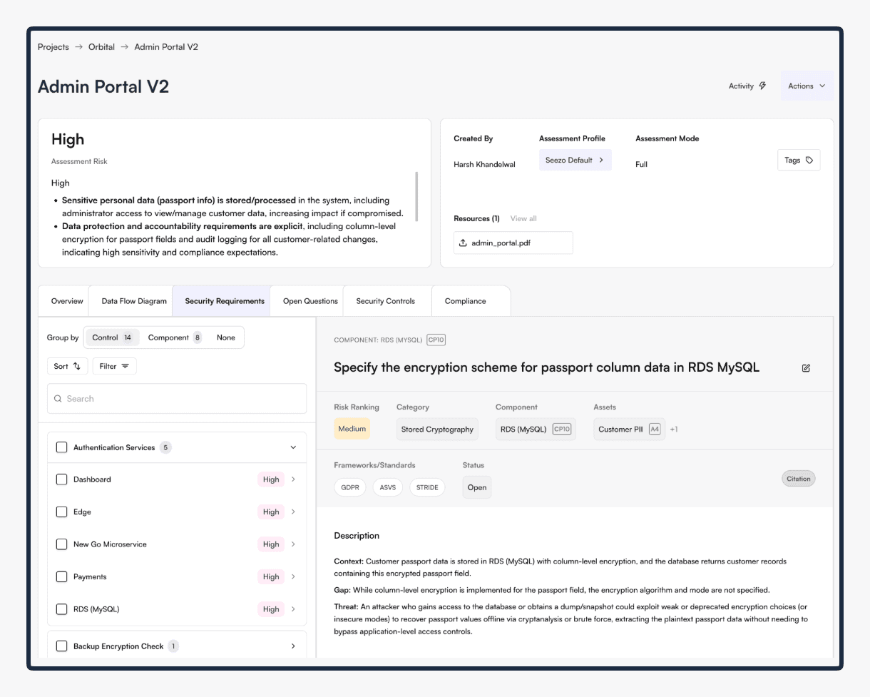 Every security requirement now traces back to a specific component. You can see which component triggered it, what data flows through it, and why we flagged it.